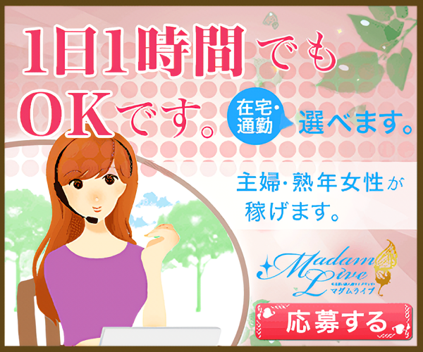 30代以上の女性の方必見の稼げるチャットレディ求人です。マダムライブでは30代以上の女性の方を対象にチャットレディとして働ける方を募集しています。カメラでご自身の姿を映して、男性の方とお話しするというのが仕事内容です。顔出しは必須ではない為、テレフォンレディのような感覚での働き方もできます。在宅でも働けますし、専任スタッフがいる事務所に出勤して働くことも可能です。報酬は1分あたり50円~75円以上。時給にすると3,000円~4,500円に!複数の男性が視聴するタイプの配信ですと、見て頂いている男性が増えるたびに報酬が倍になっていき、さらなる高収入が見込めます。貴女の年齢が武器となって稼げるマダムライブで働いてみませんか?